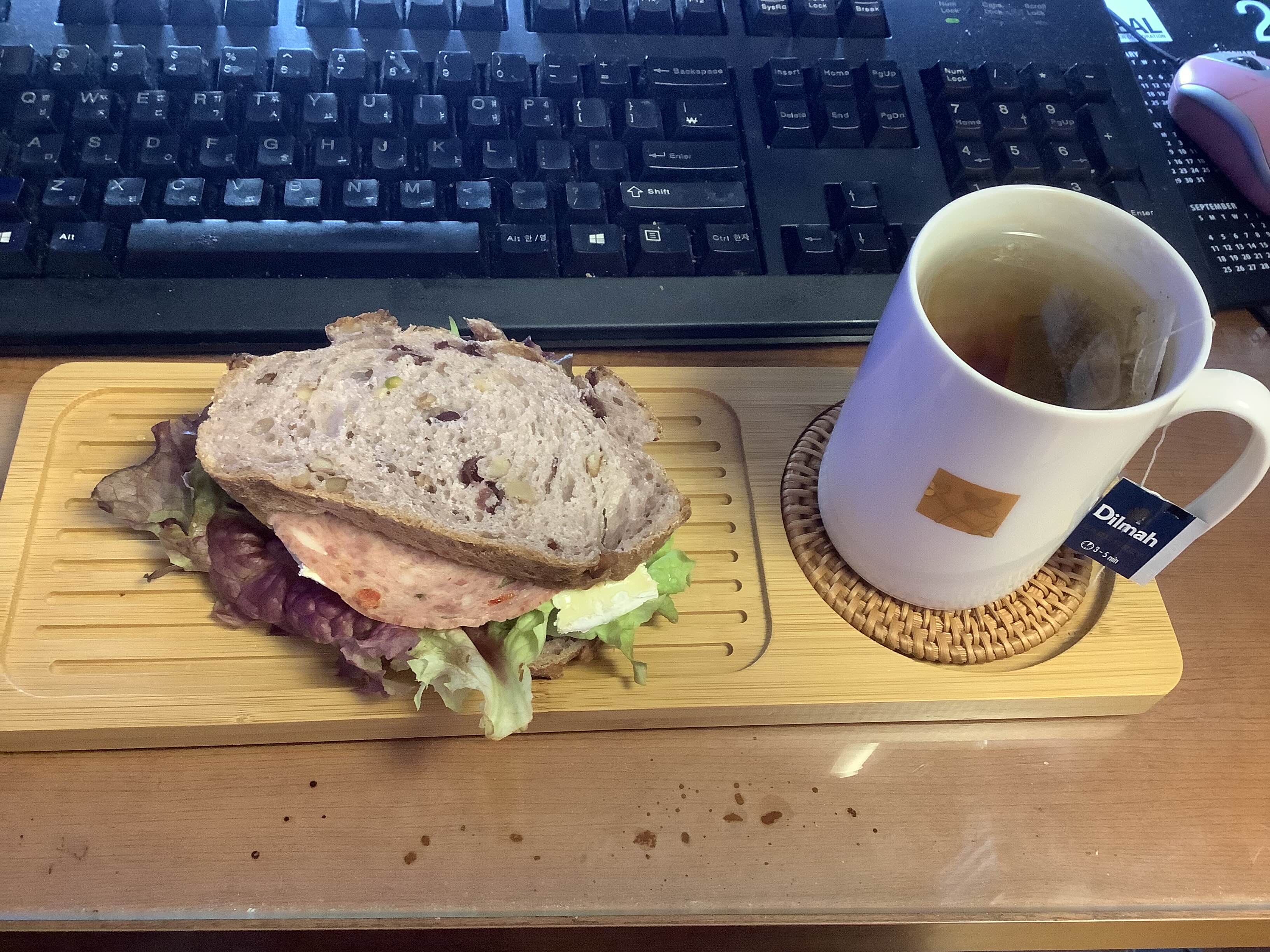 성심당 호두 크랜베리 캉파뉴에 브리치즈햄토마토 샌드위치. 은은한 딜마 얼그레이 홍차와 잘 어울림.