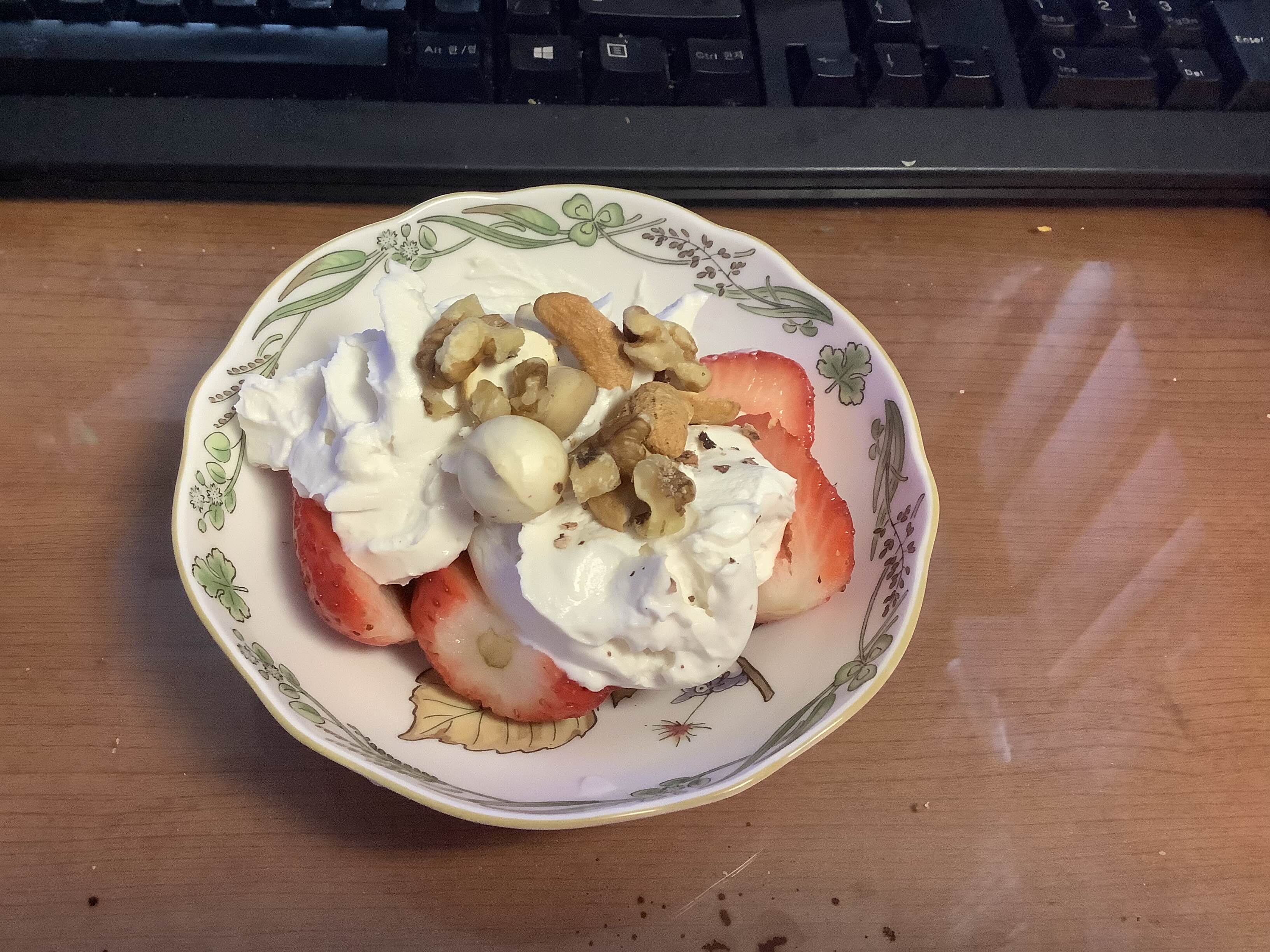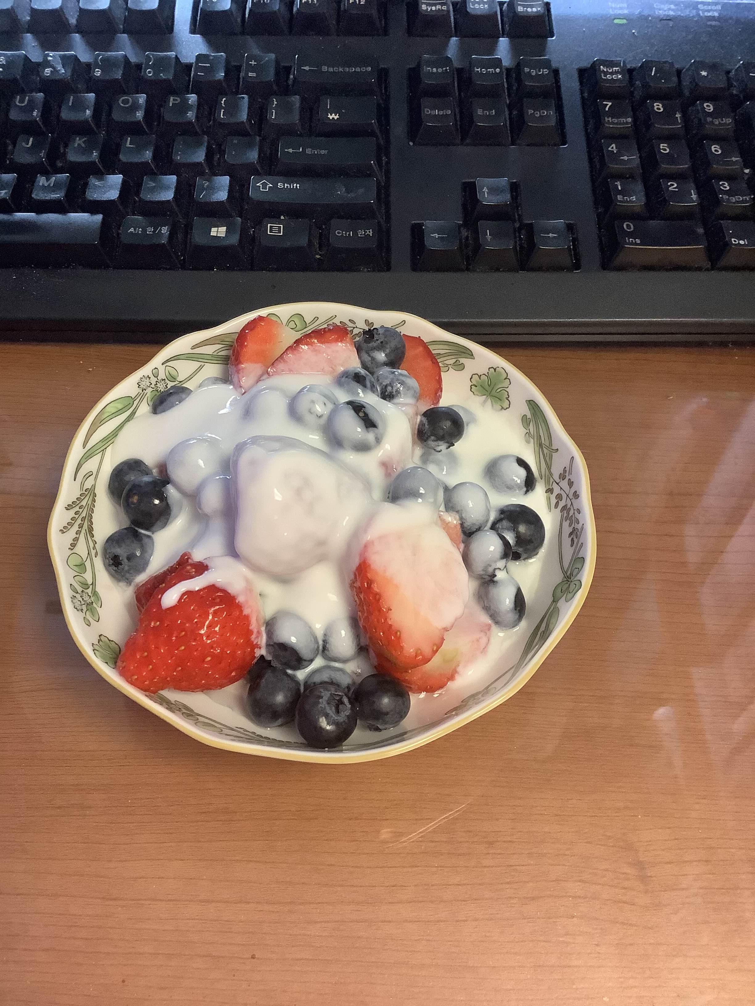 자가 제조 플레인 요거트에 딸기와 블루베리. 딸기 철이 슬슬 끝나고 있는데 열심히 먹어줘야겠다.