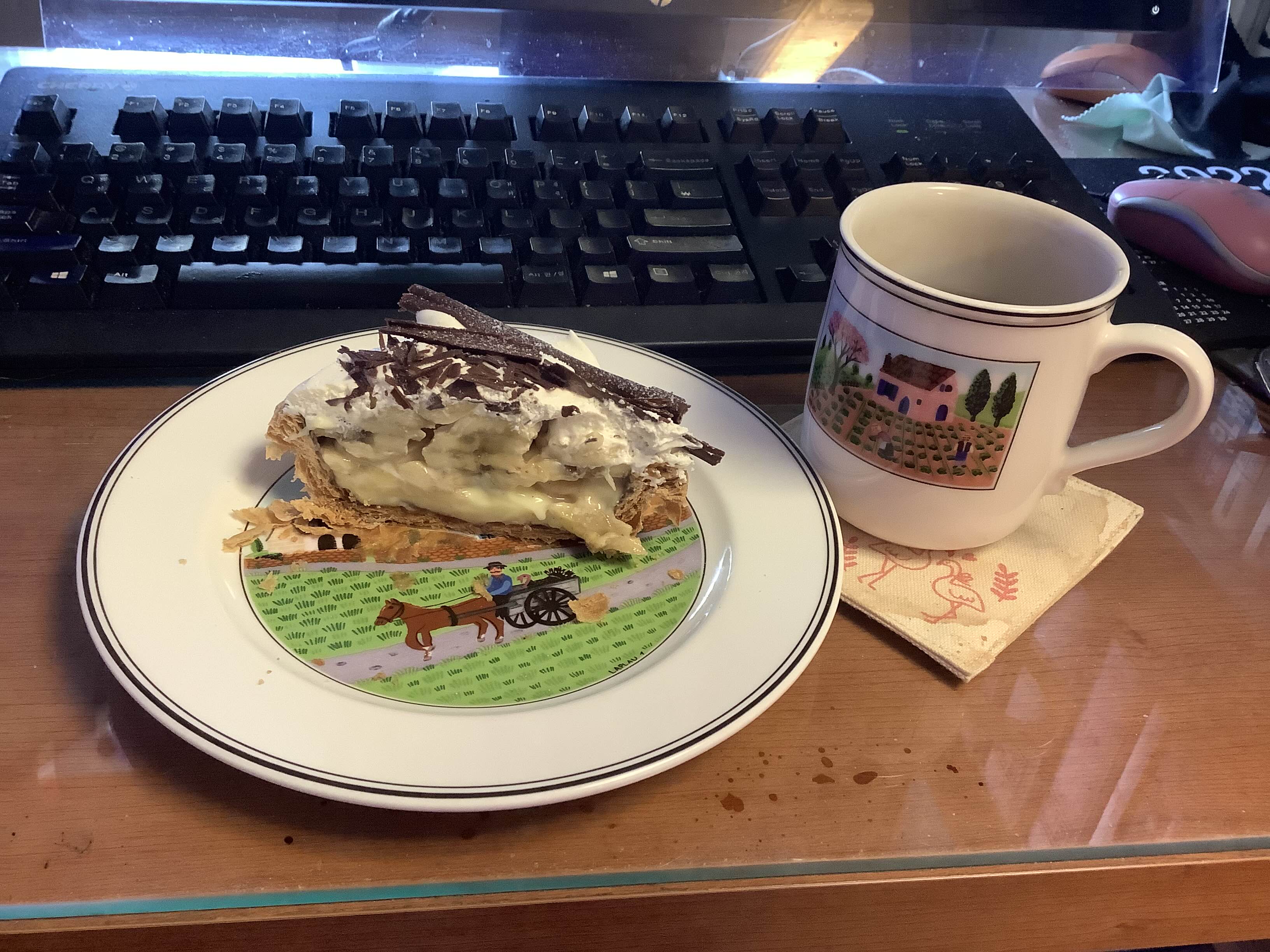 전날 못 먹고 남은 밀푀유. 세로로 밀푀유를 쌓아서 부서지지 않고 먹기가 참 좋다. 신라호텔도 이렇게 나오는데 원조가 어딜까란 의문에 다들 카페 드 리옹일거라고 의견일치. 만약 대기업 걸 카피했으면 김앤장 같은 대형 로펌 붙여서 아작을 냈지 이렇게 조용히 번성할 수 없었다... 에 돈도 걸겠음.
