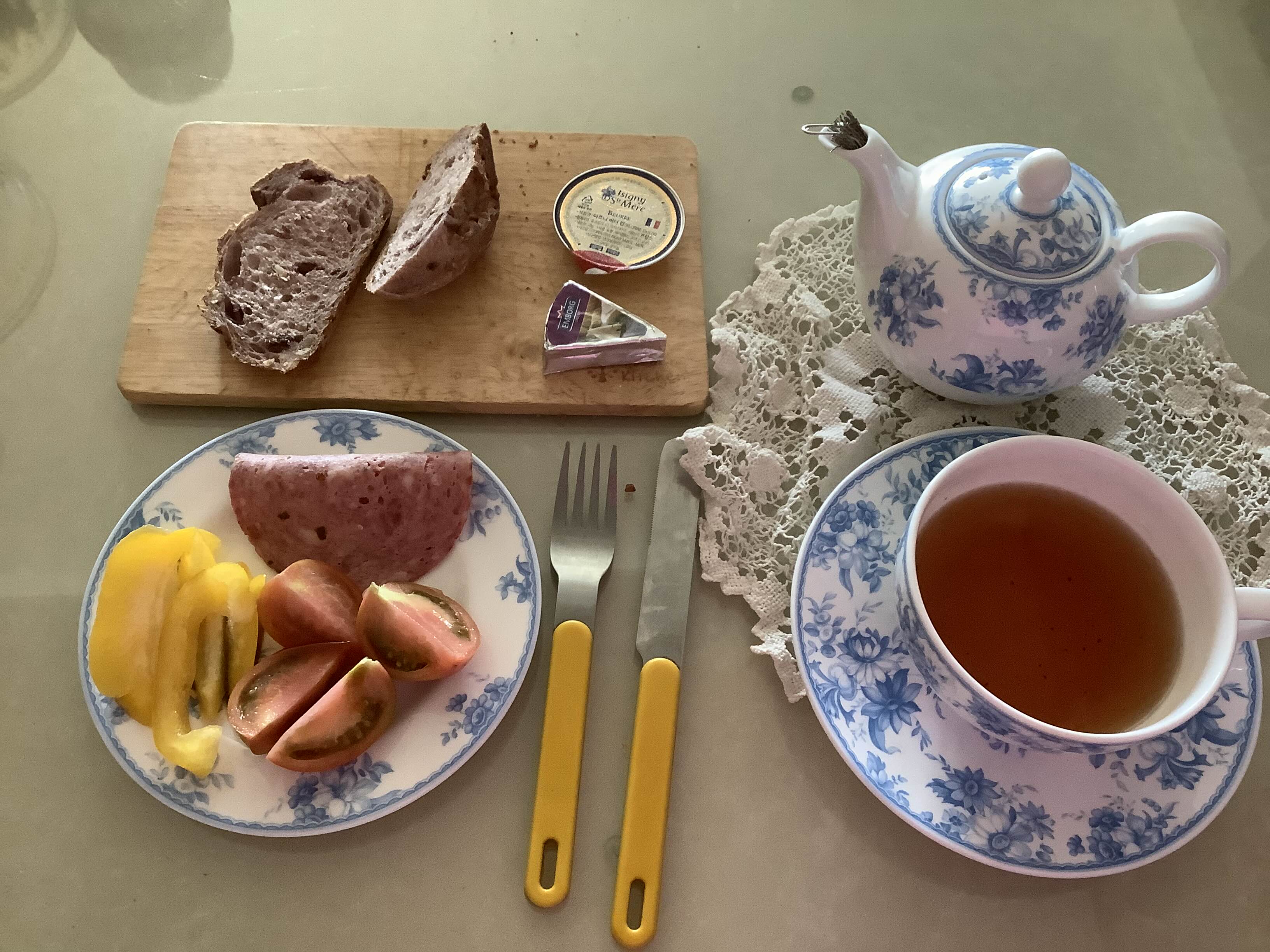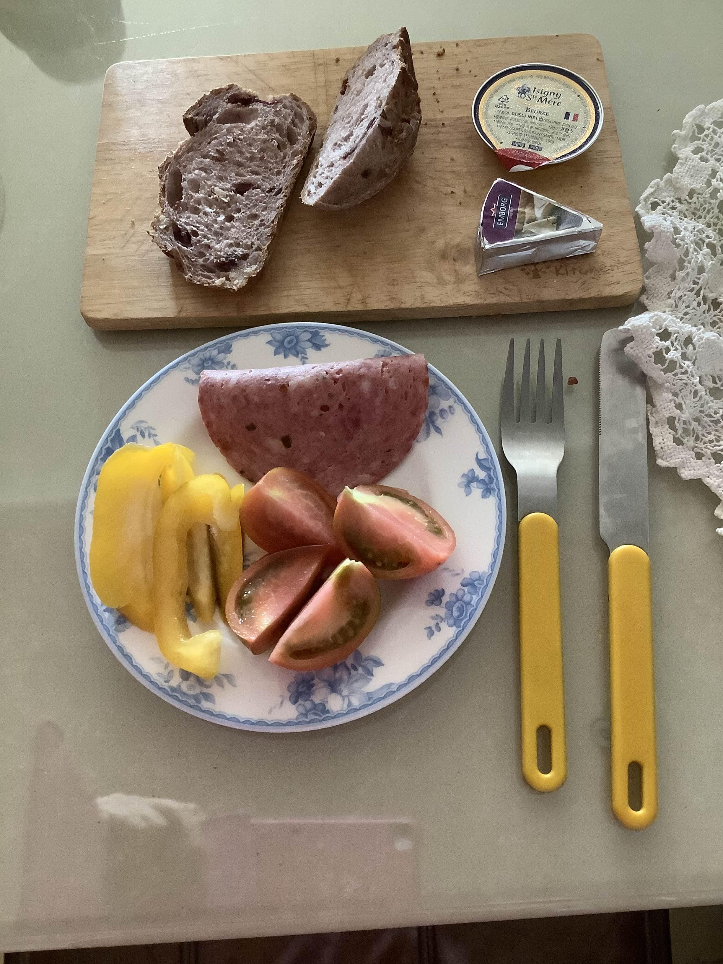토요일 아점. 무시무시하게 비싼 햄 한장에 짭짤이 토마토.와 어글리어스에서 온 파프리카(무지 달고 맛있었음) & 성심당 호두크랜베리 깡파뉴에 해로즈의 애프터눈 블랜딩 홍차. 성심당의 호두~깡파뉴는 샌드위치용으론 괜찮겠으나 그냥 빵만 먹기엔 내용물이 밋밋.