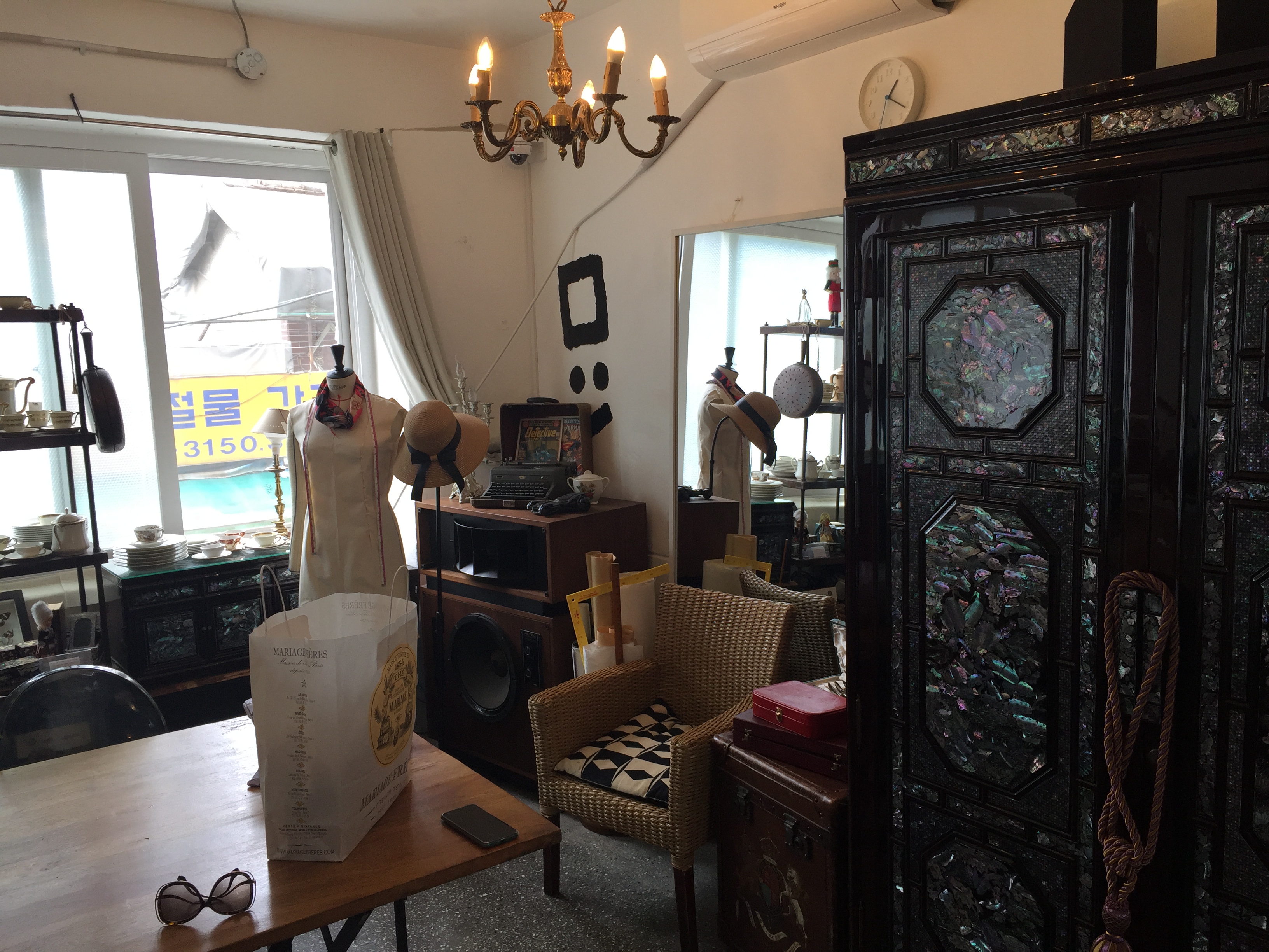 공구싸롱 아랫층. 국내 디자이너들의 옷, 패션용품, 유럽 패션용품 & 유럽 빈티지를 판매하고 마리아쥬 차와 커피, 술을 마실 수 있는 근사한 공간. 자개 장농과 서양 앤틱 가구가 어울릴 수 있다는 건 디자이너니까 가능한 대담한 배치다…. 감탄. 사진엔 없는데 화장실 문도 자개장 활용했고 색동벽이다. 👍. 옥상에서 파티도 한다던데 담에는 거기서 바베큐 파티를 하기로 했음.