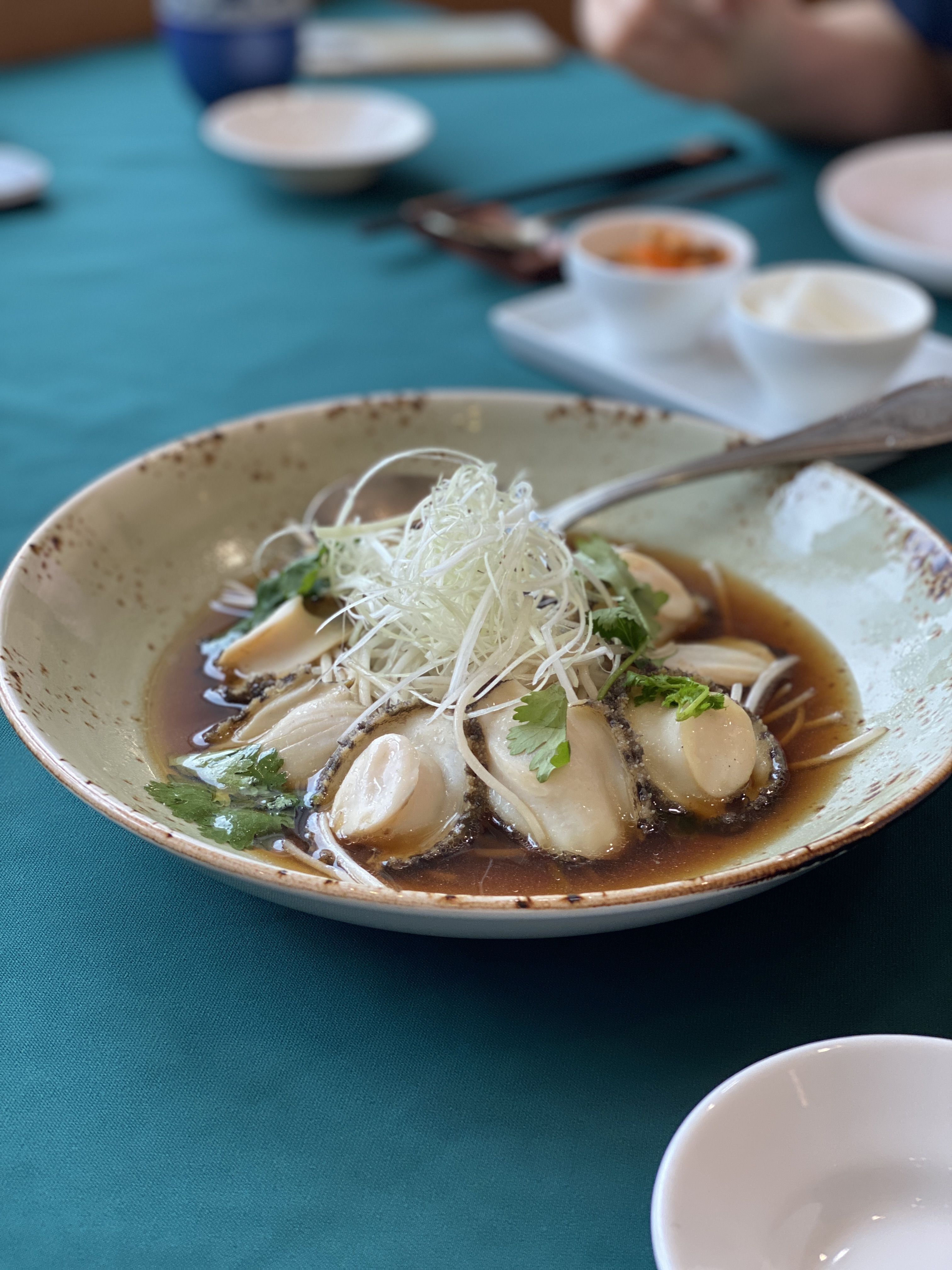 전복을 살짝 쪄서 볶은 숙주 위에 두르고 그 위에 얇게 채 썬 파와 고수를 얹고 간장 소스를 뿌린 전채. 이게 이날 나온 요리 중에 가장 맛있고 특이했음. 집에서 한번 해봐야겠다. 폼 나고 별로 안 귀찮고 손님 접대용으로도 딱일듯. 고스와 숙주, 전복의 조화가 굿!!!인데 숙주 싫어하는 사람에게는 좀 난이도가 있을 수도.