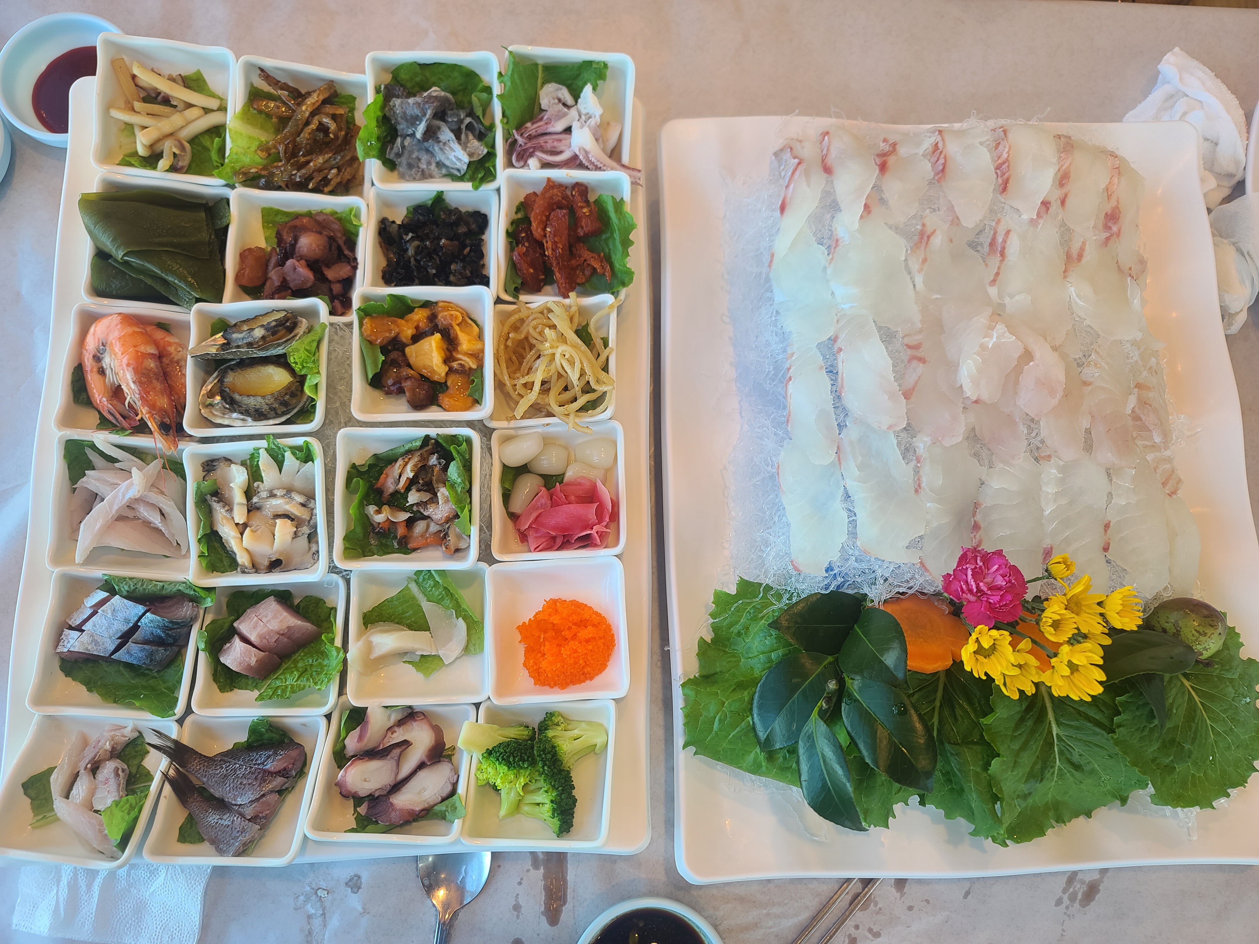 이날 작살로 잡은 10KG 짜리 광어가 들어왔다고 (일년에 몇번 안 들어온다고) 사장님 이하 모두 자랑하면서 나온 광어회.
