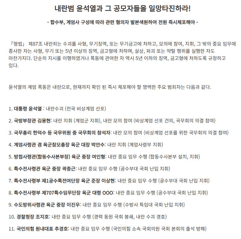 ※ 조선미디어그룹, 채널A, 아시아경제, 한국경제, 뉴스타파의 본 보도자료 인용을 불허합니다 [보도자료] 내란범 윤석열과 그 공모자들을 일망타진하라! - 합수부, 계엄사 구성에 따라 관련 혐